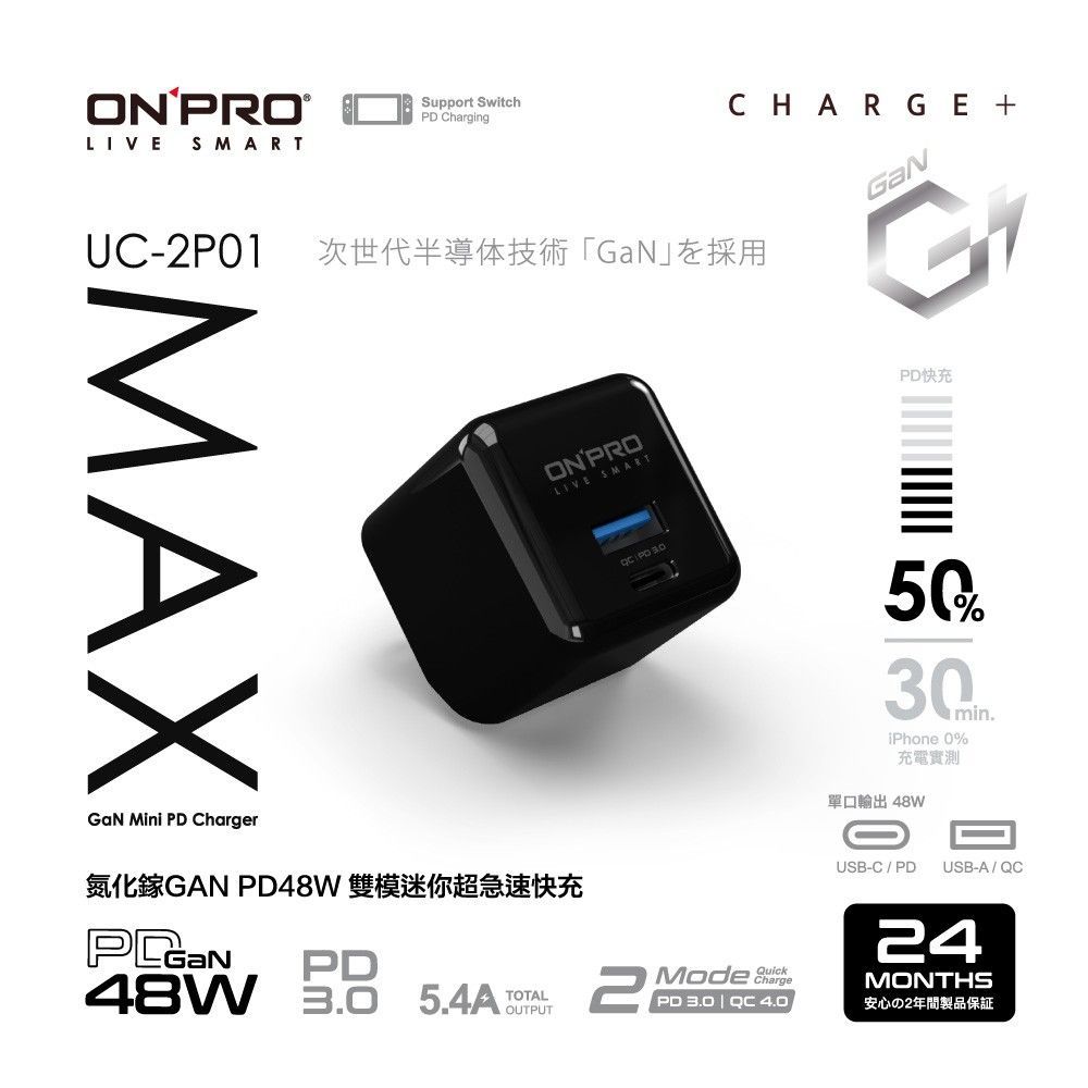【ONPRO】UC-2P01 GAN 48W 第四代氮化鎵超急速充電器【Max版】